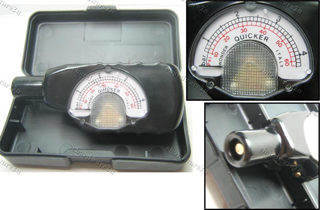Accurate 0-60 PCR pressure gauge from Wonder, Italy. Pressure reading remains in place until the release button is pressed. Comes in a plastic case. Ideal for the glove box.