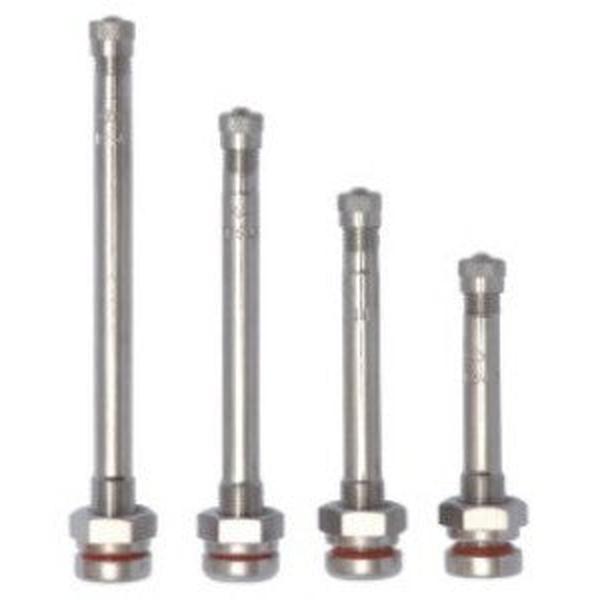 Straight nickel plated valve for steel truck wheels with 9.7 mm (.390") rim holes. Complete with cap, core and built-in O-Ring. Effective length is 49mm. Bend angle 0 degree.